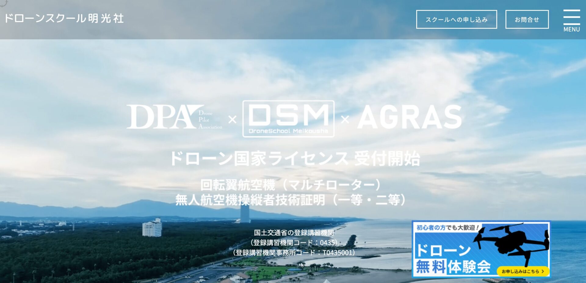| 受講コース | ・国家資格コース ・資材運搬コース ・農薬散布マスターコース ・建物点検コース | ・国家資格コース ・ビジネスコース ・スマート農業コース ・DIPS2.0ベーシック講座 | ・国家資格コース ・ドローン検定3級講座 ・基礎技能講習 ・ドローン検定3級+基礎技能講習 ・応用技能講習 | ・国家資格コース ・ICT測量講習 3次元データ化コース ・ICT測量講習 測量技士コース ・ドローンプログラミングコース |